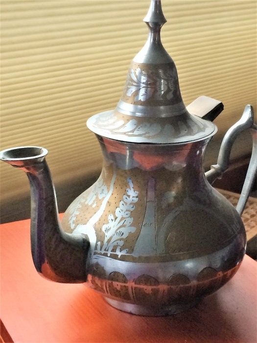 In addition to two scarves and memories, we bring home one other treasured souvenir. We forego the gleaming, silvery teapots which everyone seems eager to snatch at the guide’s preferred shop. Instead, we wander into a quieter shop, and choose a 100-year old teapot to remember all the steaming cups of mint tea — the sweet (literally), ubiquitous gesture of hospitality — we’ve imbibed everywhere in Morocco.