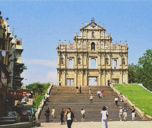 This type of uniquely Portuguese pavement is not Macau’s most famous attraction, however. That distinction belongs to the ruins of Saint Paul where a Jesuit church once stood. All you see now is its façade. It’s a rather remarkable sight, perched on a hill like a flat drawing on blue paper (the cloudless sky on a nice day). At the bottom of the stairs when you see the church towering over you and the neighborhood around it, you wonder what sort of construction technique allows it to keep standing. And it’s been that way for nearly 200 years.