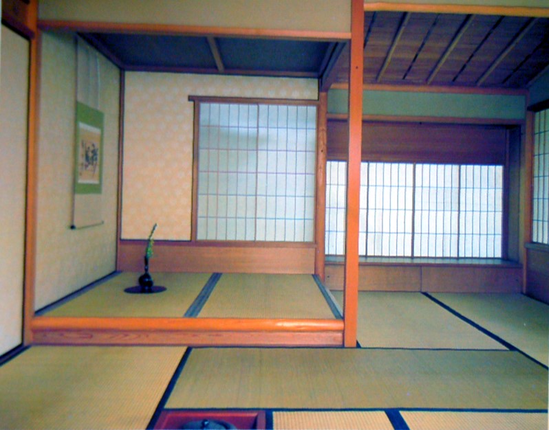 The Japanese room often serves multiple purposes. In the daytime, its inhabitants may work, play, talk, and dine there. They can sit on floor cushions or directly on the mats, which are softer than wood. At night, they clear away cushions and low tables and lay out futons to sleep on. A single tatami is actually the size of a single bed. In contrast, our shoji room has furniture you would ordinarily find in Western living rooms.