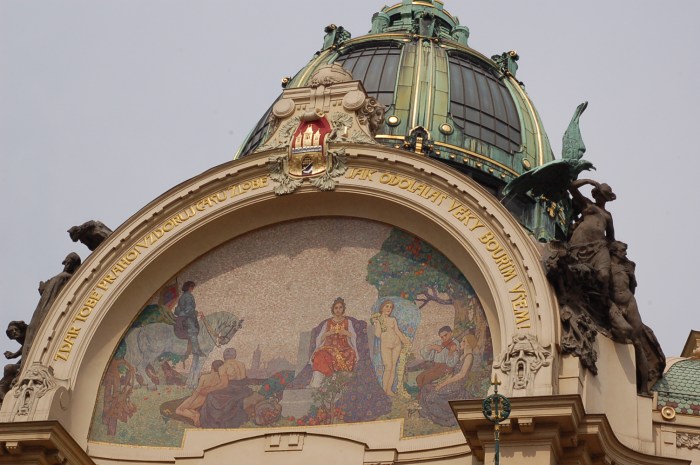 Regrettable, I’d say. Especially if you like art or beautiful things. The Municipal House (Obecni Dum, in Czech), is a magnificent specimen of art nouveau, all 40,000 square feet of it. Quite unique, therefore, from the usual tourist itinerary of palaces, castles, and other royal houses.